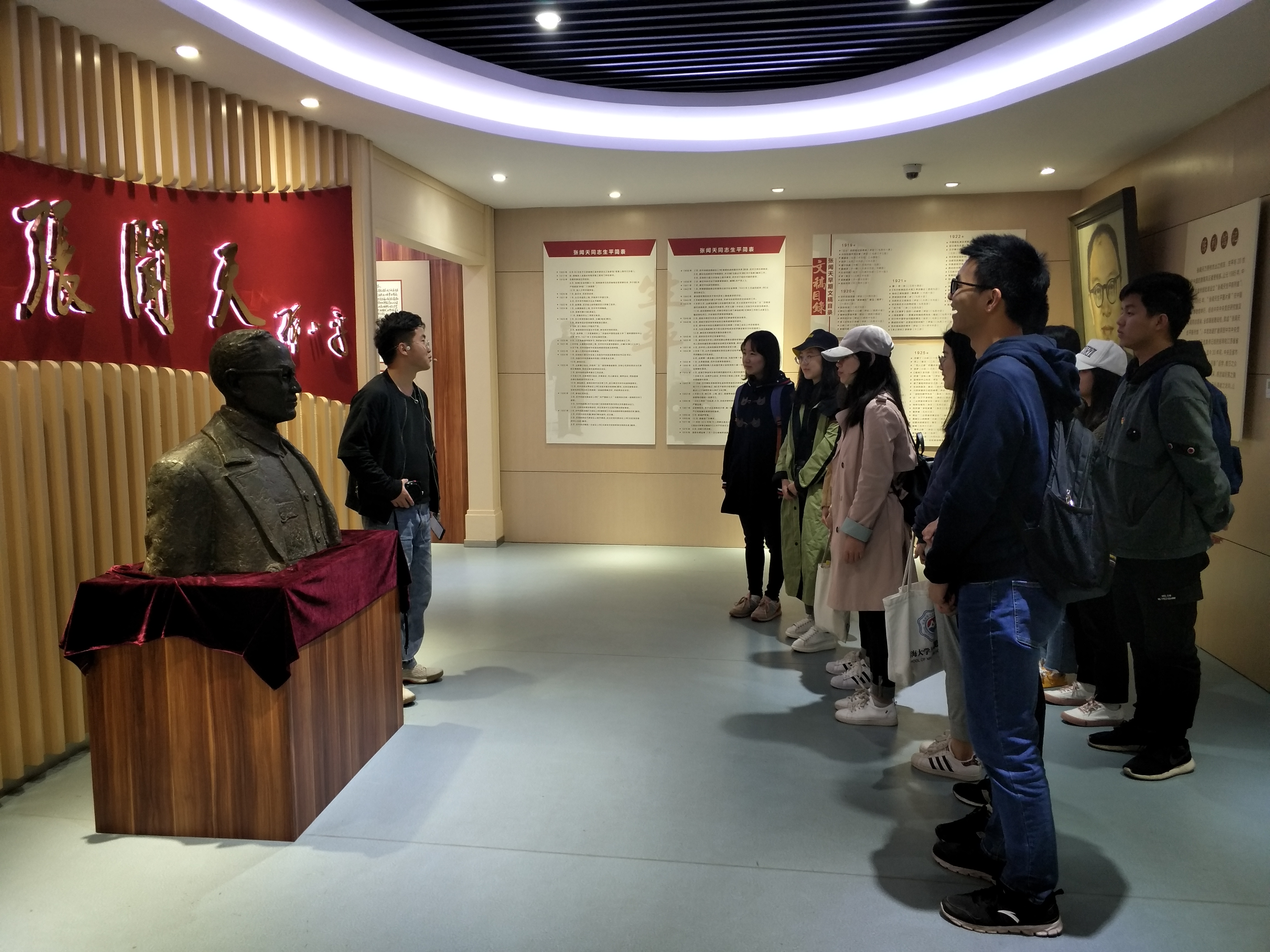 “生活的理想,就是为了理想的生活”。1938年4月12日,张闻天在延安陕北公学的露天会场这样说。他说人要有信念,有所追求,为了自己的理想不畏艰苦、孜孜以求。张闻天用自己一生的辉煌与坎坷,实践了他当年对青年提出的要求。无论经历怎样的挫折,张闻天始终没有停止对真理的追求,始终没有放弃自己的人生理想,没有放弃尊重个人人格的主张,没有随波逐流,没有空谈理想。而对于这样一个人,当思政同学走进bw必威西汉姆联官网张闻天生平陈列馆时,每个人都是庄严且肃穆的,不只是因为馆内陈列的是多年前的文字、照片等珍贵材料,更重要的是馆口站立的是青年们的榜样,他被雕刻成了信仰的模样。小河马宣讲团成员的讲解的声音在馆内飘散,从张闻天的个人介绍到生平梳理,同学们惊叹于张闻天当时的年轻和勇气,年仅19岁就敢于并勇于斗争,但其实1919年只是他一生的缩影,从出生到投身革命,短短数年,而投身革命后为党和人民无私奉献,他坚持了一生。