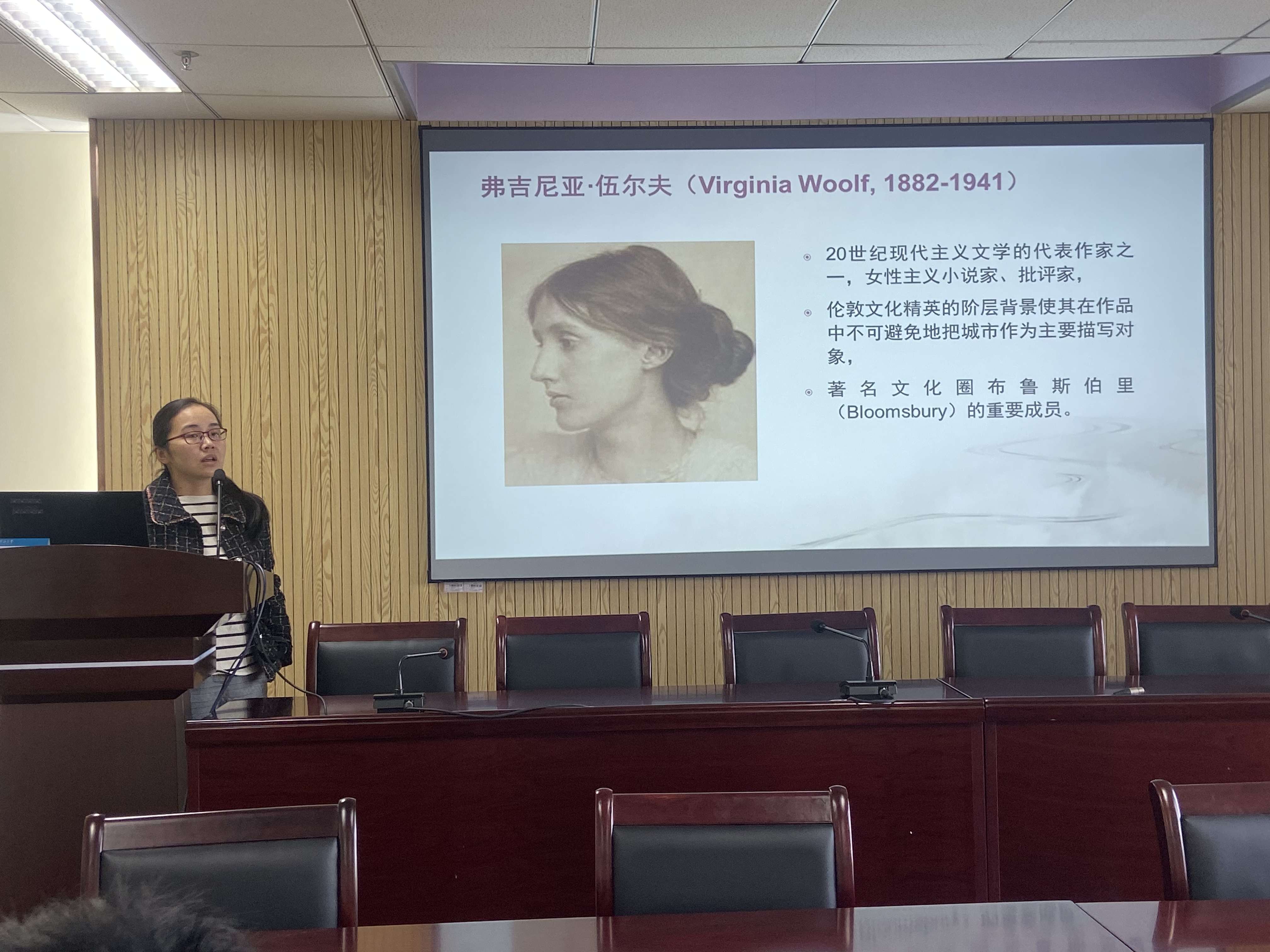 外国语学院石苗苗老师,以“河与海的思考:弗吉尼亚·伍尔夫小说的城市空间与乡村空间研究”为题,以“河”与“海”为线索,介绍了弗吉尼亚·伍尔夫小说中对现代性的反思。