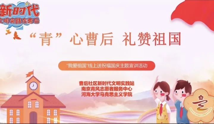 为了充分展现当代老员工的良好精神风貌,弘扬爱国主义精神,引导小朋友感受国庆节氛围,进一步了解祖国历史、发展成就,增强青少年对祖国的热爱,bw必威西汉姆联官网21级思政一班联合曹后社区于10月5日晚开展“我爱祖国”线上送祝福国庆主题宣讲活动。