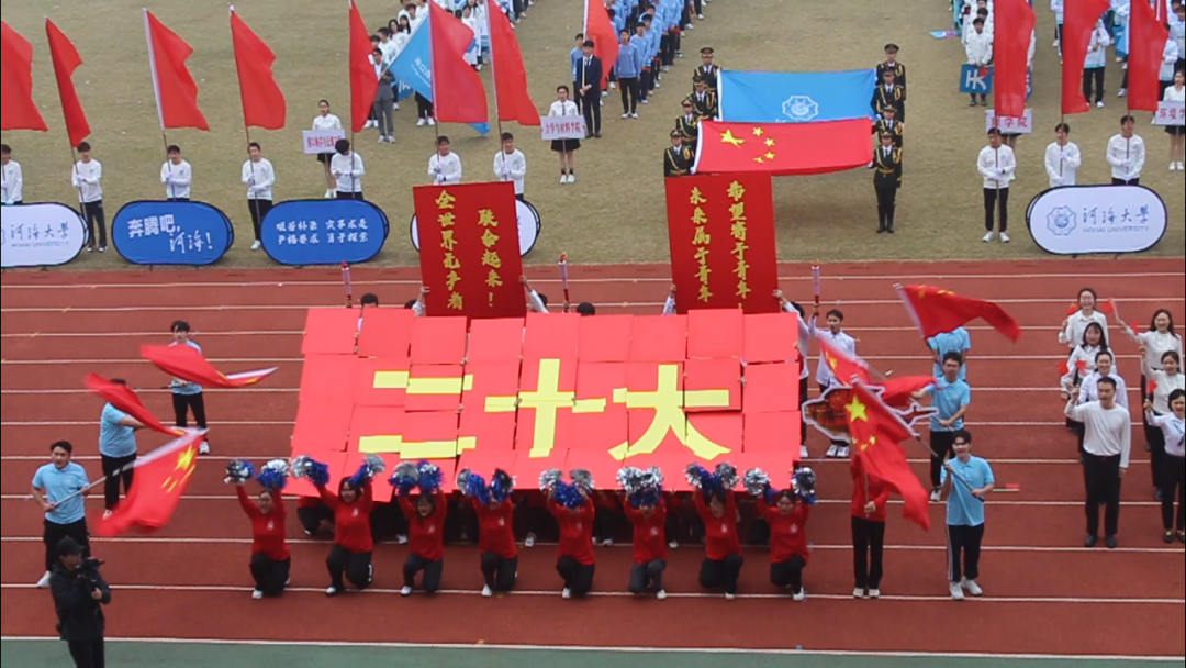 在指挥员的带领下,参与方队的马院学子面带微笑、朝气蓬勃地走向主席台前,并在引导下顺利进行了方队表演:挥舞着五星红旗、高举《共产党宣言》、《习近平新时代中国特色社会主义思想基本问题》;随着游曳于浪花中的红船驶过,同学们喊出了“信马传马,振兴中华”的响亮口号,方队中心的同学更是配合默契地拼出了“二十大”的字样,以此庆祝中国共产党第二十次全国代表大会的成功召开。