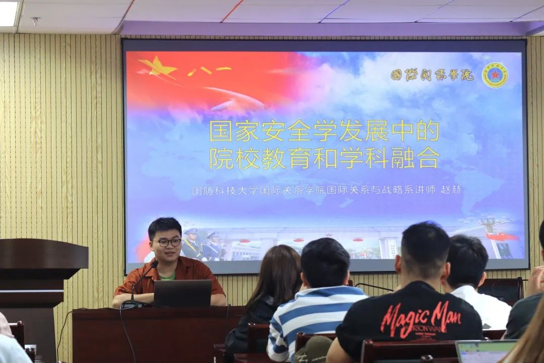 国防科技大学国际关系学院赵赫老师为两校同学就“国家安全学发展中的院校教育和学科融合”这一主题,从国家安全学学科发展概况、“总体国家安全观”与“国家安全学”、“国家安全学”三个方面展开介绍,聚焦国家安全学团队建设的现实需要、国内国家安全学团队建设现存缺点、多学科交叉下培育军队国家安全学的难点进行详细论述。在交流的结尾,赵老师引用陈寅恪《陈垣敦煌劫余录序》中的话,对两校两院的同学做出学术研究要注重新材料、新方法、新理论,做到人无我有、人有我优的寄语。