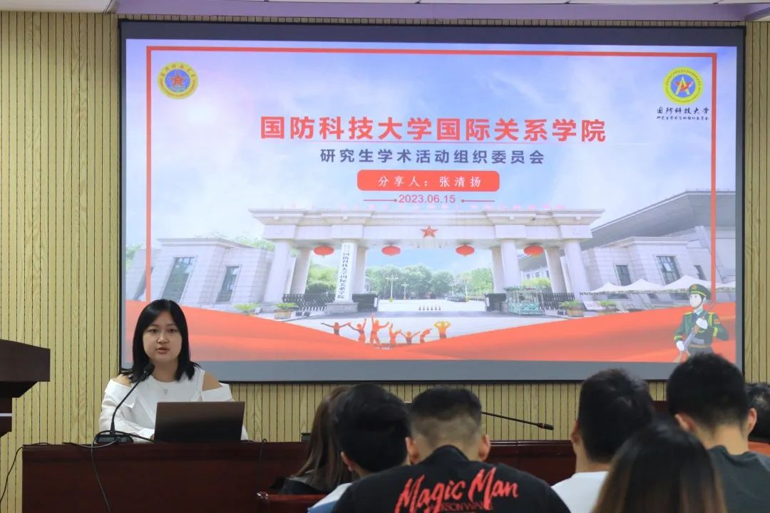 国防科技大学国际关系学院研委会外联部张清扬同学对其学院研究生学术活动组织委员会做详细介绍,内容包括研委会的管理机构、职责范围、各部门工作职责;特别分享了研委会的特色部门“两刊编辑部”,共负责两部非正式刊物,用于分享研究生的阶段性学习成果、学科的发展动态、交流学习最新的研究动态,为研究生会的工作发展提供借鉴。