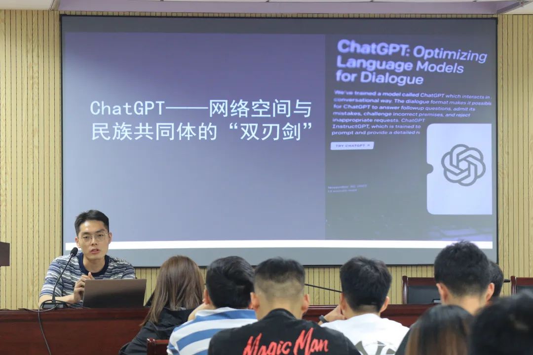 国防科技大学国际关系学院2022级英语语言文学袁满同学,就“ChatGPT——网络空间与民族共同体的‘双刃剑’”主题,与同学们探讨了如何平衡好科技创新所带来的重大机遇与潜在风险之间的关系问题。他提到,ChatGPT的问世既带来了网络空间安全的隐患,也助力了网络空间安全的维护,对于中华民族共同体理论体系的构建带来了机遇和挑战,未来应持续关注ChatGPT的发展动态。
