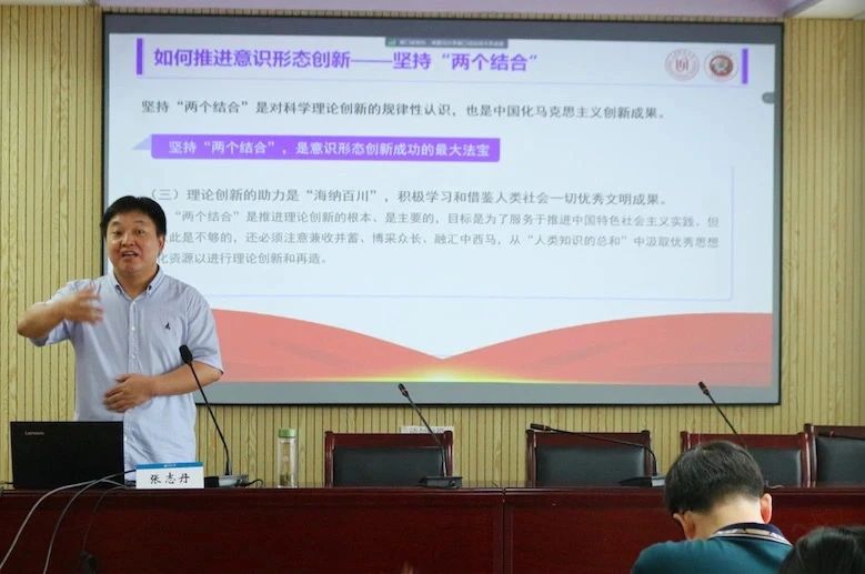 在主题报告中,张志丹教授从坚持“两个结合”是意识形态创新成功的最大法宝,坚持以立为主、破除错误观点对于意识形态创新的干扰,科学定位意识形态创新的主体和评价以实现守正创新三个层面展开深入系统的论述。张志丹教授首先分析了如何推进意识形态创新,进而从理论创新的前提是“不忘老祖宗”、理论创新的根本是“讲新话”、理论创新的助力是“海纳百川”三个方面展开论述,提出必须坚持“魂脉”指导和“根脉”主体、坚持守正创新、积极学习和借鉴人类社会一切优秀文明成果。接着,张志丹教授指出坚持以立为本,就必须拒斥“文化虚无论”、“文化复古论”、“外来文化论”和“非意识形态化”的错误观点对于意识形态创新的干扰。最后,张志丹教授指出我们党的理论是党和人民集体智慧的结晶,创新理论的定位是马克思主义基本原理运用性的理论创新,为此必须树立科学的意识形态创新态度。