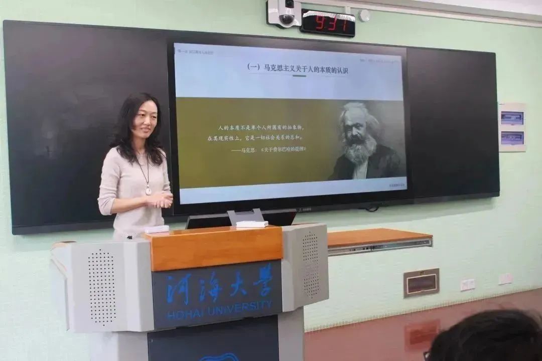肖雅月老师以“马克思主义关于人的本质的认识”为主题,运用多重视角梳理东西方哲学家以及马克思主义经典作家对于人性的观点,她从西方哲学家视角思考,旁引亚里士多德、帕斯卡和费尔巴哈等人的主张;从东方哲学家视角切入,谈及孟子的性本善与荀子的性本恶论述;接着回归马克思对人的本质所做的科学回答。肖老师从探讨“人的本质的意义”到论证“个人与社会的辩证关系”,最终得出“个人与社会对立统一”的结论。