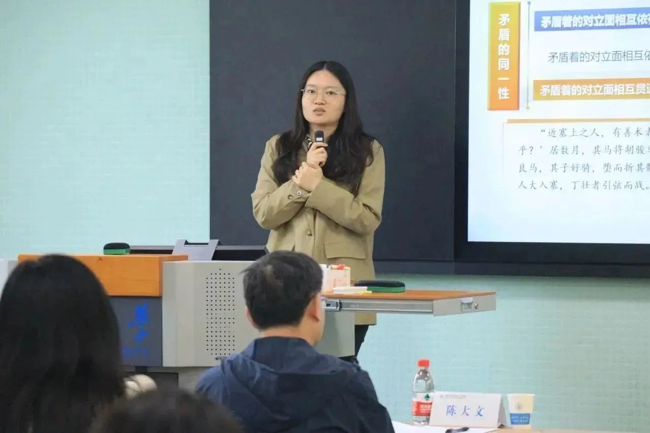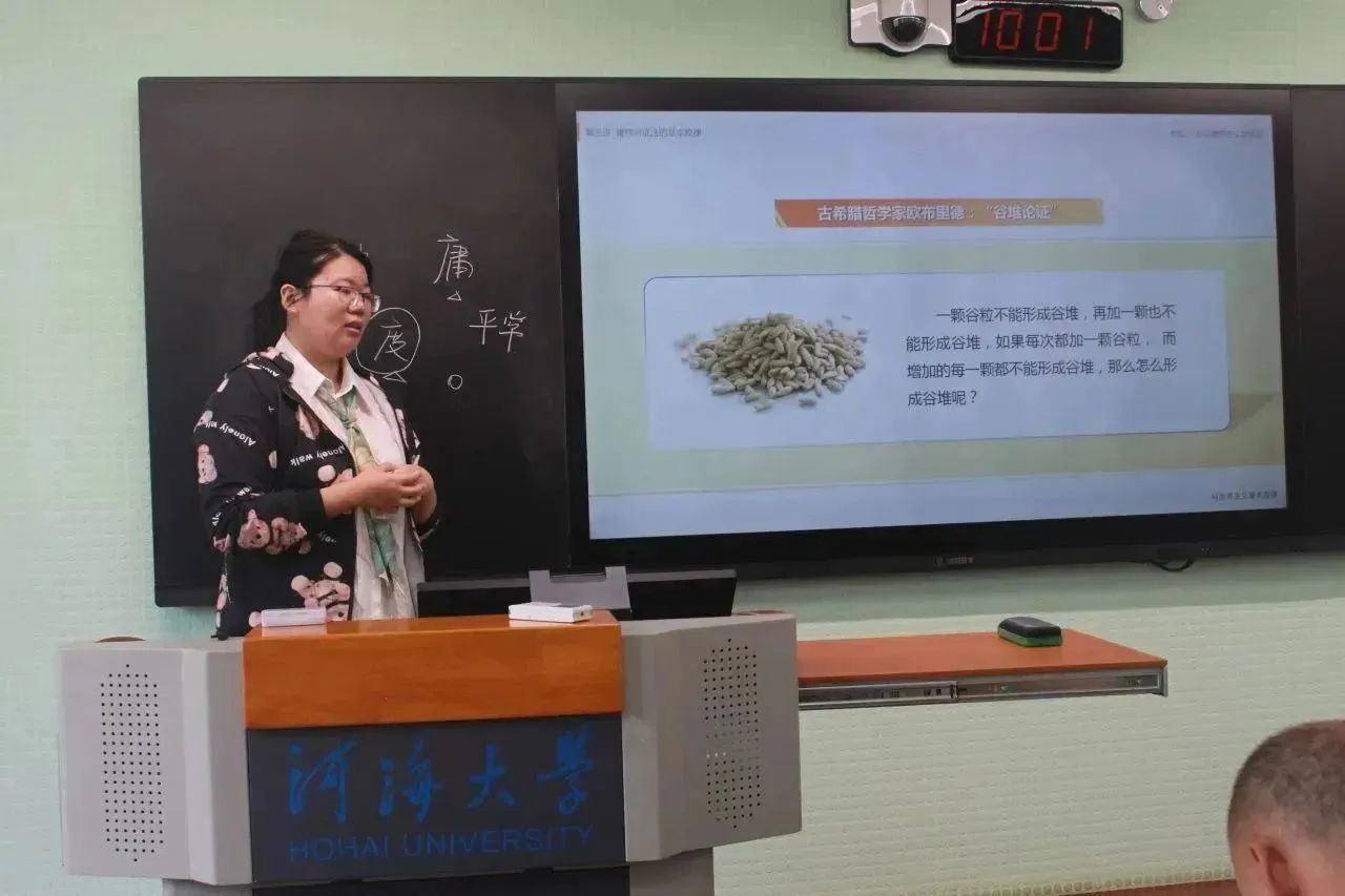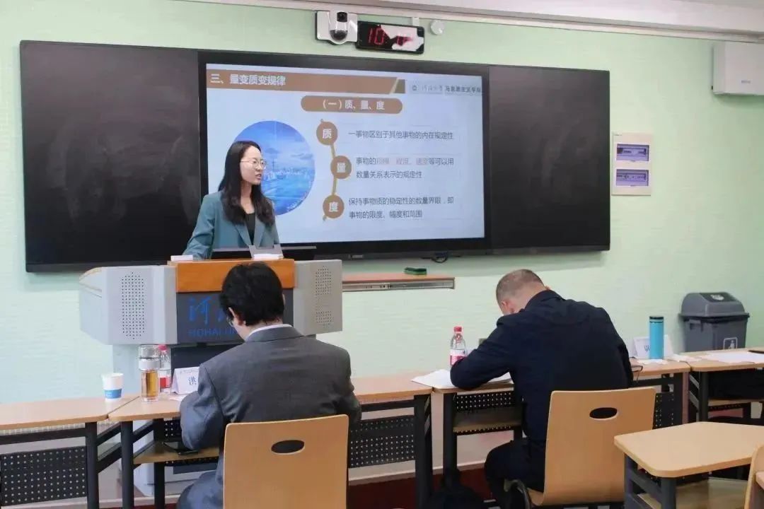 韩雪老师以“唯物辩证法的基本规律”为主题,课程聚焦量变质变规律。她以老子的“治大国,如烹小鲜”为引入,在第一部分中增设古希腊哲学家欧布里德“谷堆论证”的故事,增强了课堂趣味性;在二、三部分中分别讲授了量变与质变的定义和量变与质变的辩证关系,结合中国具体实际,把理论真正落在祖国大地上。
