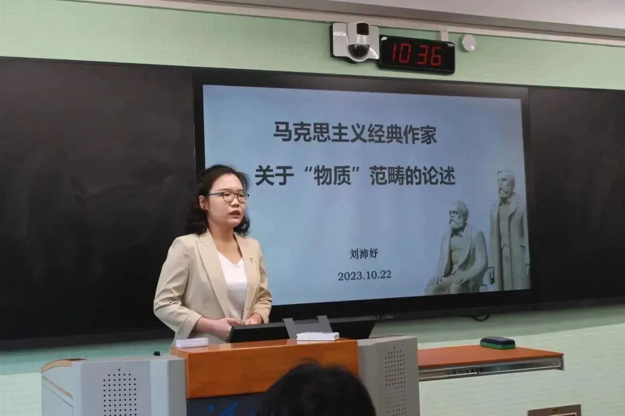 刘沛妤老师以“马克思主义经典作家关于‘物质’范畴的论述”为主题。在“问题意识”引入课堂,她不仅以苏联研究者的理论为印证,还旁引康德的理论,在对学者思想的分析与解构中升华讲授内容。刘老师关注理论现实意义,带领同学们深挖原著内涵,提出具体问题,引导同学们进行深入思考。