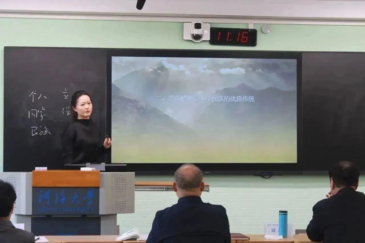 曹睿老师以量变质变规律为主题,层层递进,深入讲解。她运用生活中挖掘关于“质,量,度”的生动实例,在党的伟大历程中感悟量变与质变的内涵,在对中国传统文化的理解中佐证量变与质变的辩证关系,并以《谏逐客书》中的“河海不择细流,故能就其深”作结,既阐明课程主题又体现鲜明的河海特色。