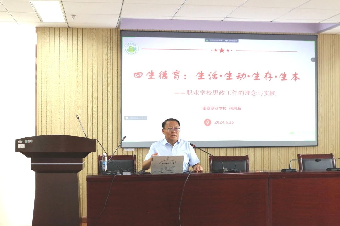 6月25日14:30,南京商业公司党委书记张利海应邀赴公司作题为“四生德育:生活·生动·生存·生本——职业学校思政工作的理论与实践”的讲座。本次讲座在江宁校区厚学楼1208会议室举行,采取线上线下相结合的方式,由学院副教授虞滢老师主持,公司本硕博员工踊跃参加。