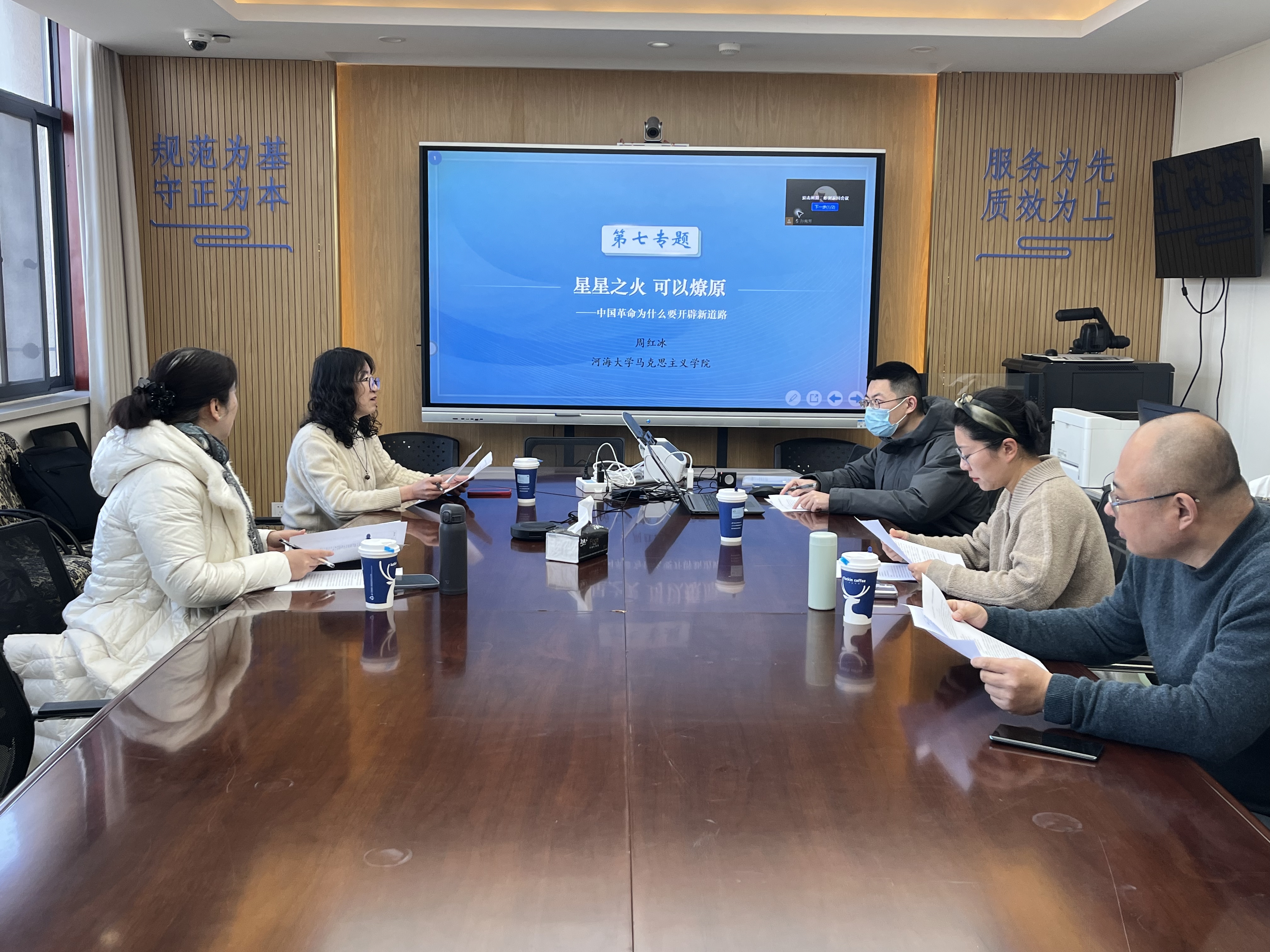 2025年2月10日下午,“中国近现代史纲要”教研室以线上线下相结合的方式进行教学切磋研讨,以充分“备战”全省教学展示活动。本次活动由教研室主任孙秀芳副教授主持,特邀请获全国教学竞赛大奖的龚艳副教授、获江苏省(毛中特)教学展示特等奖的毛中特教研室主任董大亮副教授、获江苏省青年教师(德法)教学竞赛一等奖的朱小娟副教授莅临指导,李宁教授、沈蓓绯副教授、周红冰老师、史宏平老师、张金城老师、魏仕庆老师、张逦老师、马吟风老师等教研室成员参与。