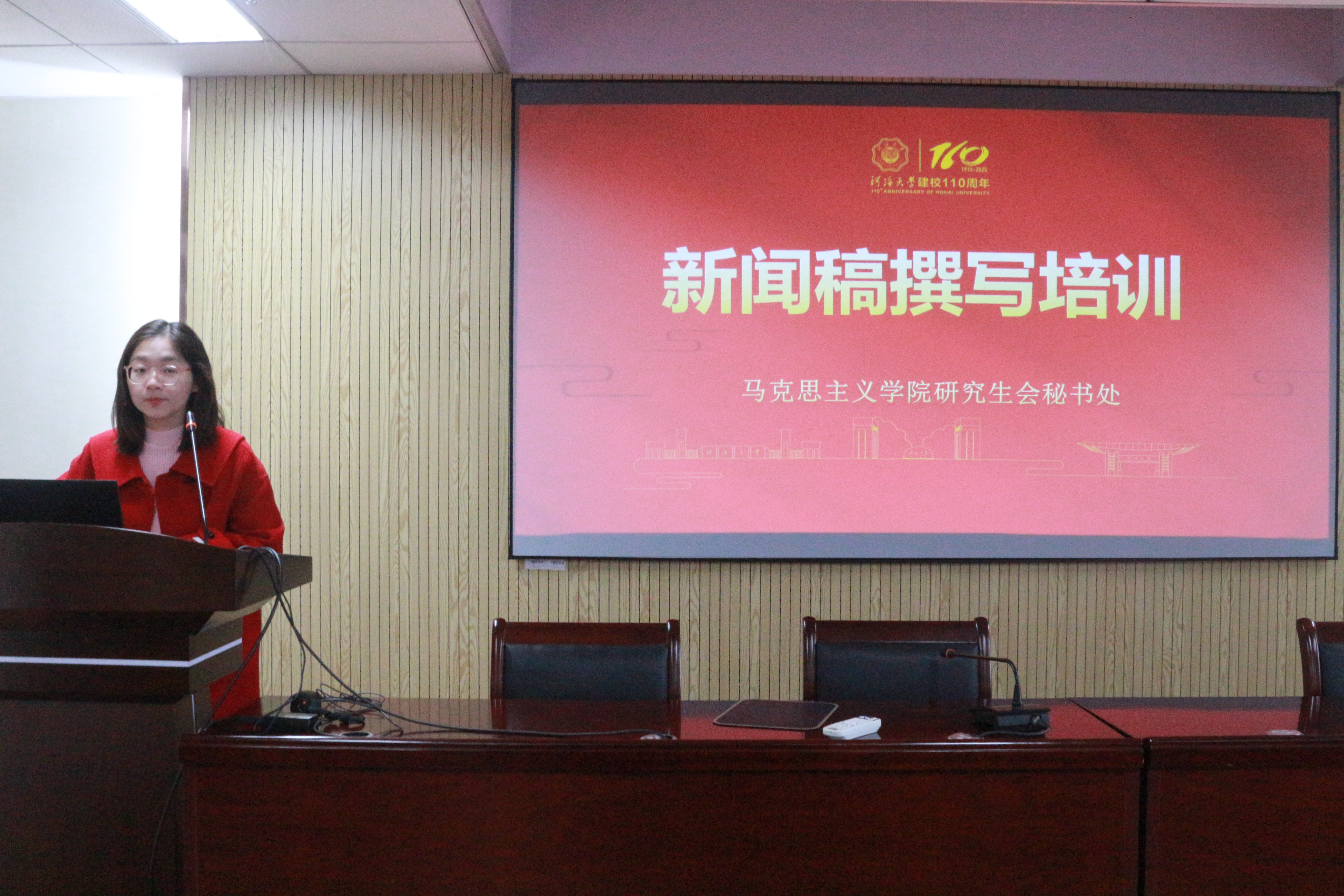 研究生会秘书处负责人于恬烨介绍了新闻稿撰写的规范与要求。她从确定类别、具体写作方法和注意事项三个方面着手,对通讯稿的类别以及内容的基本要素作出归纳与总结,并从通讯稿时效性的角度,对同学们的语言文字提出要求。