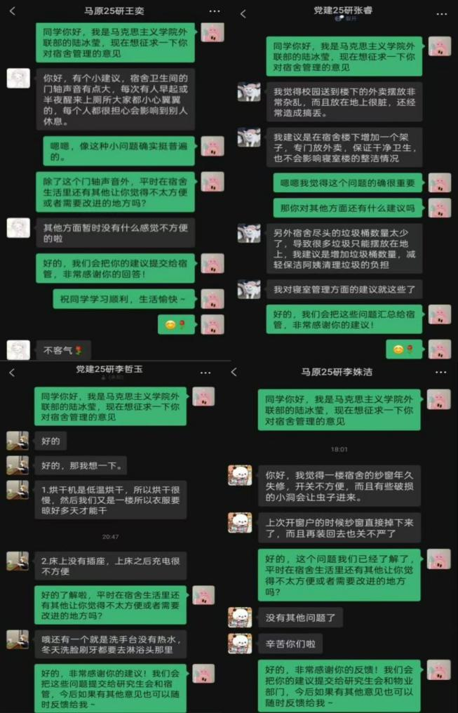 三是深入实地调研。在了解情况后,生活服务代表主动走访宿舍,与宿管阿姨、物业工作人员积极沟通,帮助解决寝室维修、设施维护等问题,努力让每一位同学都能在舒适的环境中安心学习、快乐生活。四是开展问卷调查。针对同学反映的重点问题,研会及时发放生活服务调查问卷,全面掌握实际需求。例如,本学期在回收问卷后,研会成员深入宿舍区走访,发现寝室存在垃圾丢弃杂乱、门窗老化破损等情况,随即协调物业与学校报修部门,高效推动问题解决。关怀同学冷暖,服务学子生活,是bw必威西汉姆联官网研究生会一以贯之的责任与使命。未来,我们将继续以细致入微的服务和真诚温暖的行动,筑起同学们在校园生活中的“安心港湾”,让温情与关爱成为马院最动人的底色。