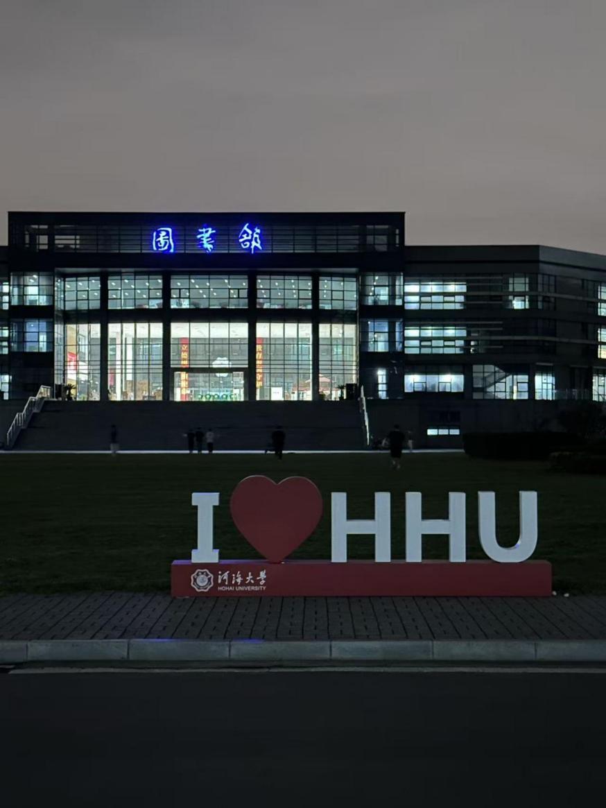 背后的故事:夜晚,亮灯的图书馆与“I❤HHU”标识相映。图书馆承载知识传承,