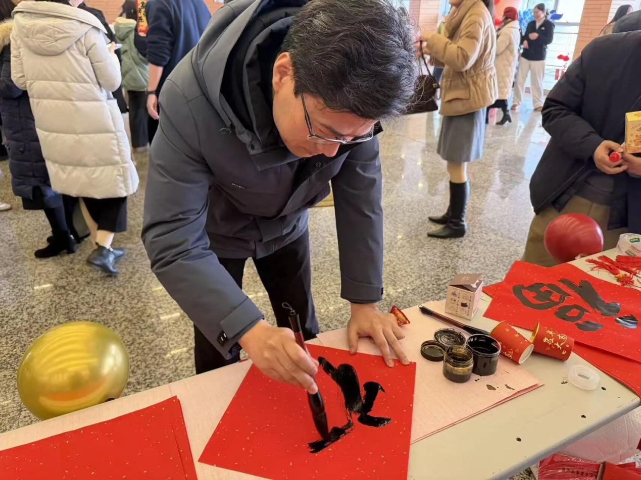 作为本次活动的特色环节,“马年吉语·诗词接龙”游戏尽显文化底蕴。老师们才情迸发、从容应答,一句句饱含马年祥瑞韵味的吉言佳句脱口而出,在诗词雅韵中传递新年祝福;“翰墨迎春”书法体验台与拓印福字案前同样人气高涨,老师们笔走龙蛇、挥毫泼墨,一幅幅苍劲有力的福字、一幅幅寓意吉祥的春联新鲜出炉,浓墨书香间凝注着对新年的真挚期许;朱红的拓印纸上印出的不仅是福字纹样,更藏着老师们对新一年的美好憧憬,大家手持亲手制作的作品,笑意盈盈地相互展示。