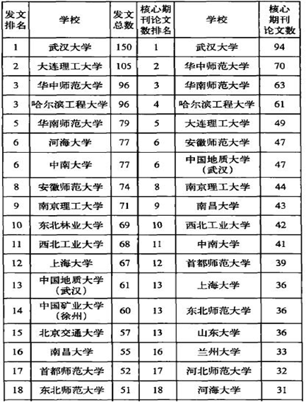 发表论文总数和核心期刊论文数排名(节选)
