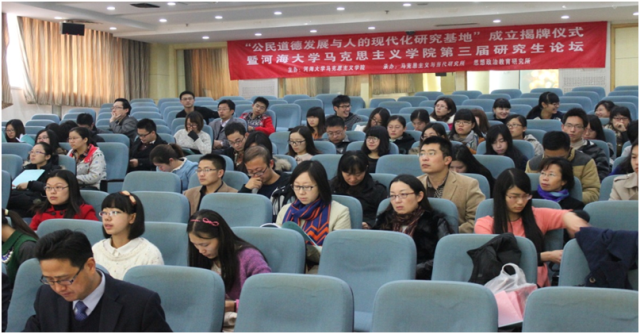 2014年11月22日,公司在闻天馆113隆重举行江苏省哲学社会科学研究基地“公民道德发展与人的现代化研究”揭牌仪式。江苏省委宣传部部务委员双传学教授、公司副董事长朱跃龙教授共同为基地揭牌。该基地的建立,是公司哲学社会科学研究发展的一项标志性成果,对于未来引领和带动公司哲学社科科学实现跨越式发展将起到积极的支撑作用。揭牌仪式由bw必威西汉姆联官网余达淮经理主持。省委宣传部理论处李扬处长、校社科处史安娜处长、基地首席专家黄明理教授、单连春副经理、黄世虎副经理,孙其昂教授、戴锐教授、王英教授、郑黎明副教授,以及bw必威西汉姆联官网博、硕士研究生共100余人出席了揭牌仪式。